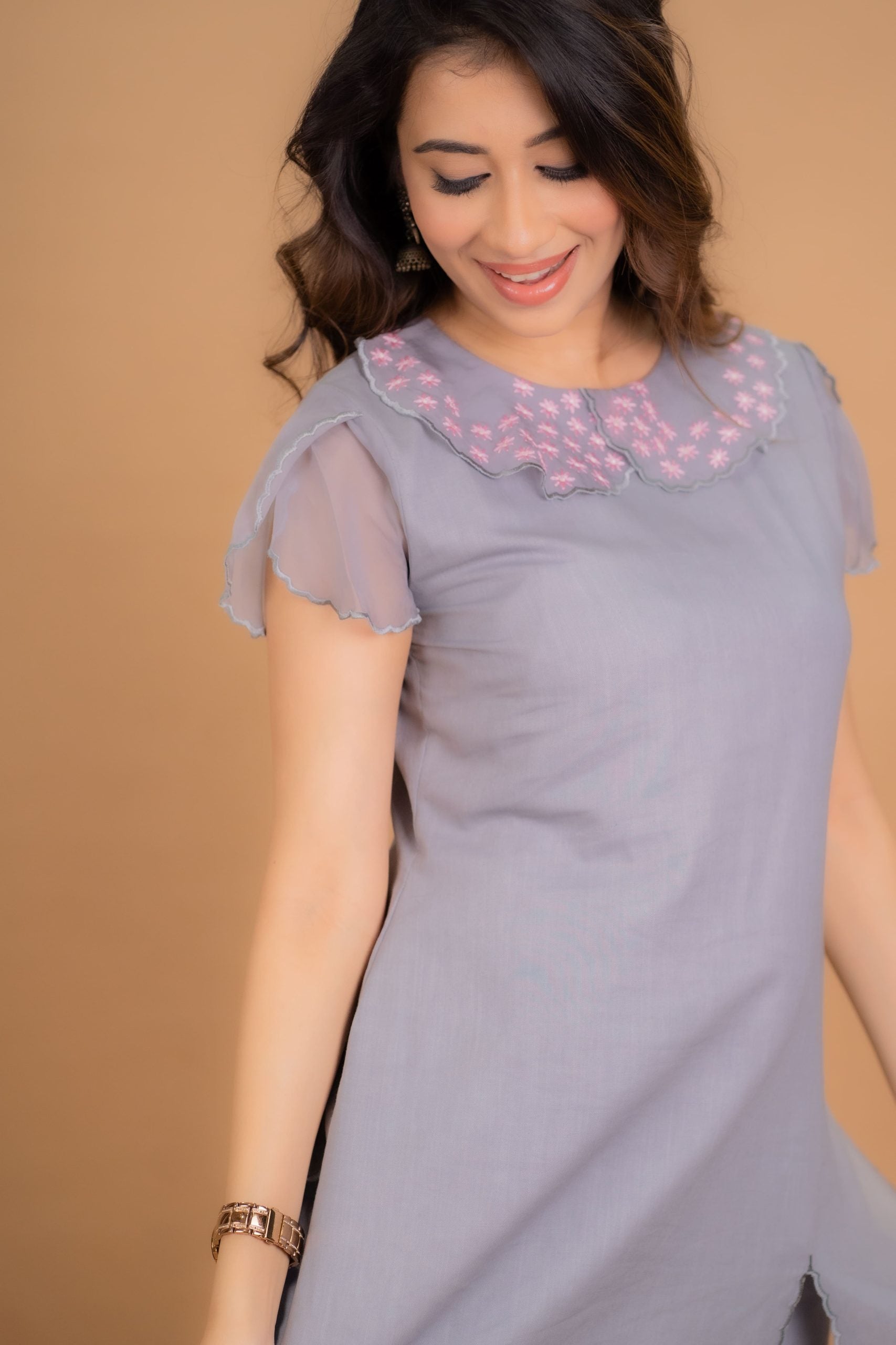This stunning ensemble features a flared dress top with a vibrant floral print, paired with matching pants for a coordinated look. It has a sleek front cut and a wavy border.