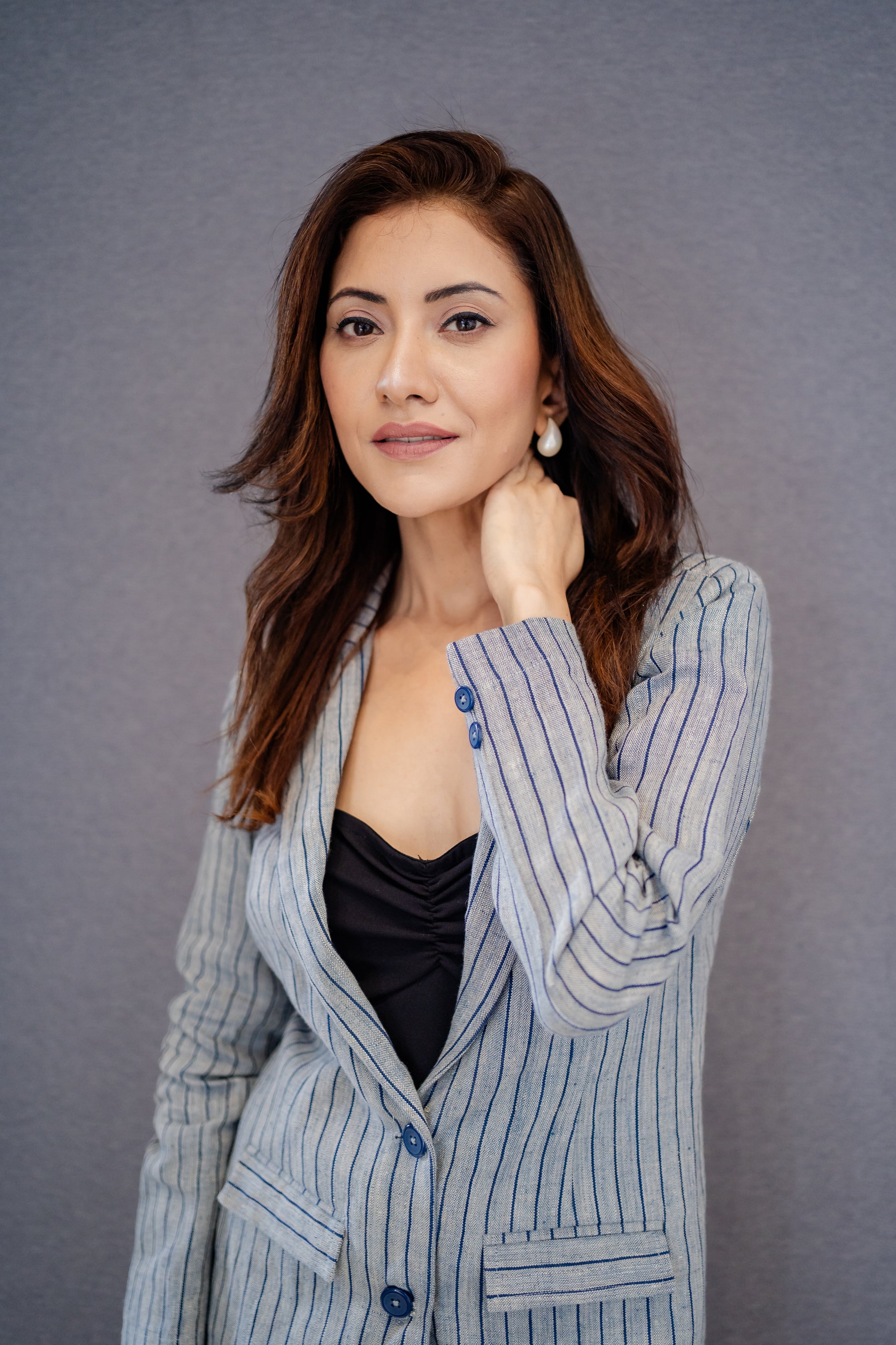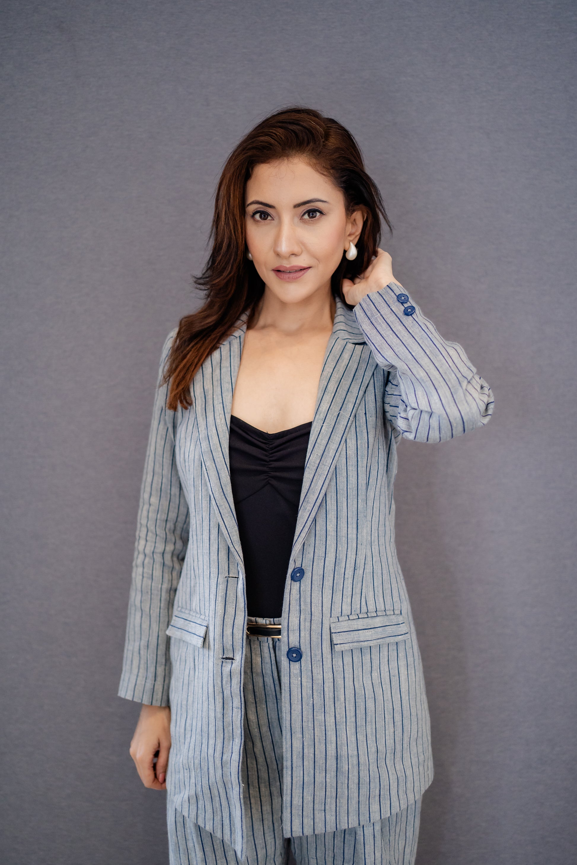 The ensemble features a full-sleeved blazer with a subtle pinstripe design, which offers a polished, elongating silhouette. Complementing the blazer are formal linen pants, tailored for a relaxed yet structured fit that ensures both elegance and comfort throughout your workday.