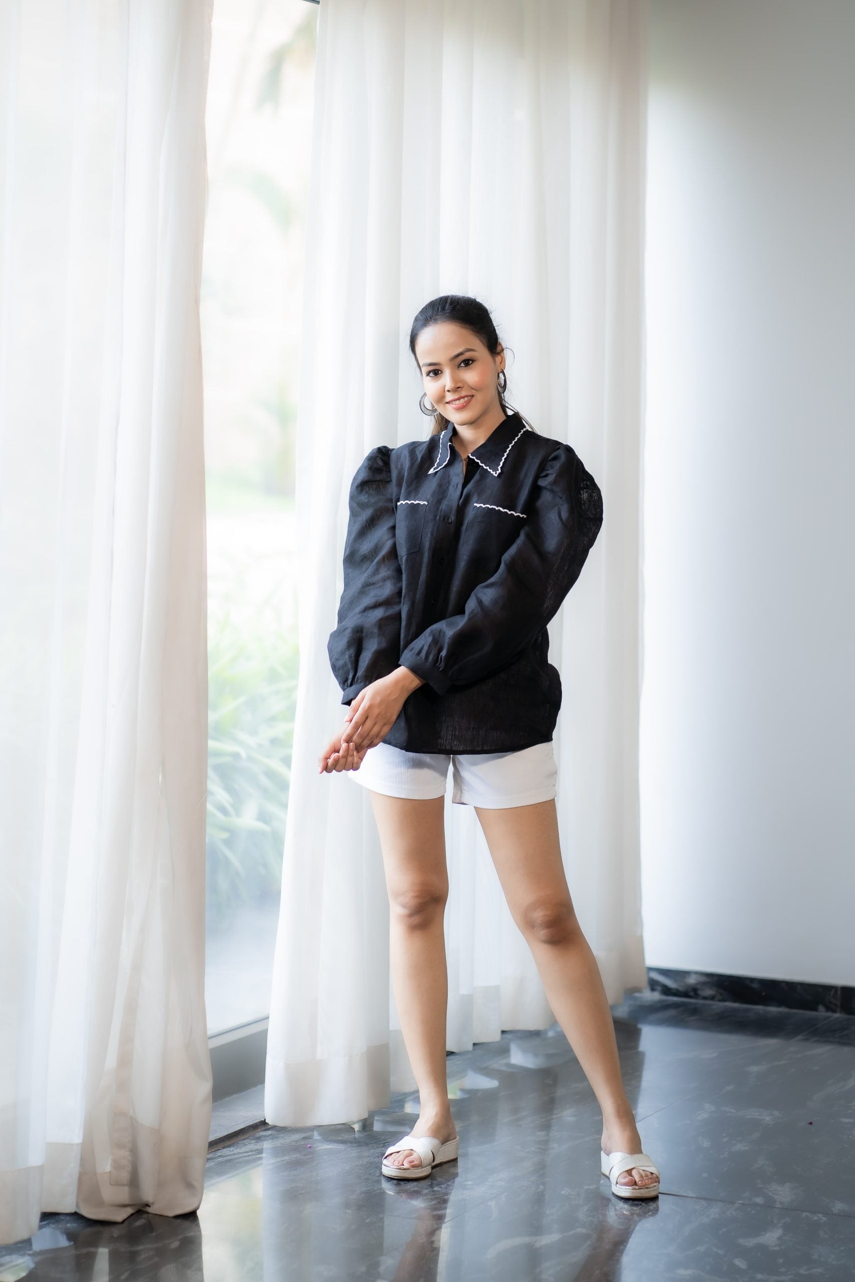 Experience the refined simplicity of our Linen Ruffled Puff Shirt. Made from premium linen, this shirt offers a relaxed yet polished look, ideal for warm weather. The scalloped collar provides a subtle, graceful detail, while the puff sleeves with two pockets add a modern, dimensional shape. The natural texture of the linen ensures breathable comfort, making it a versatile piece for various summer occasions. Pair it with your favorite bottoms for an effortlessly stylish ensemble.