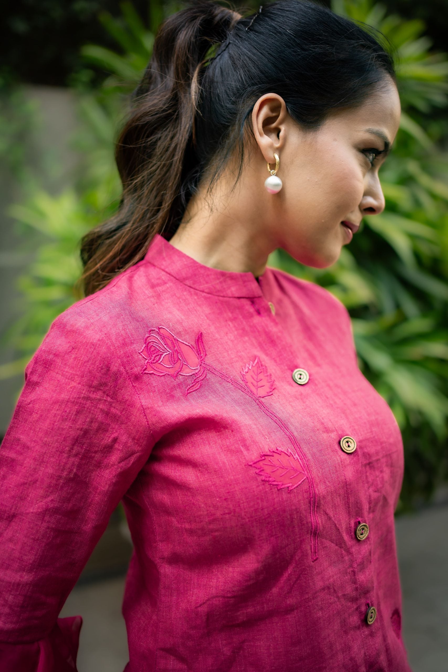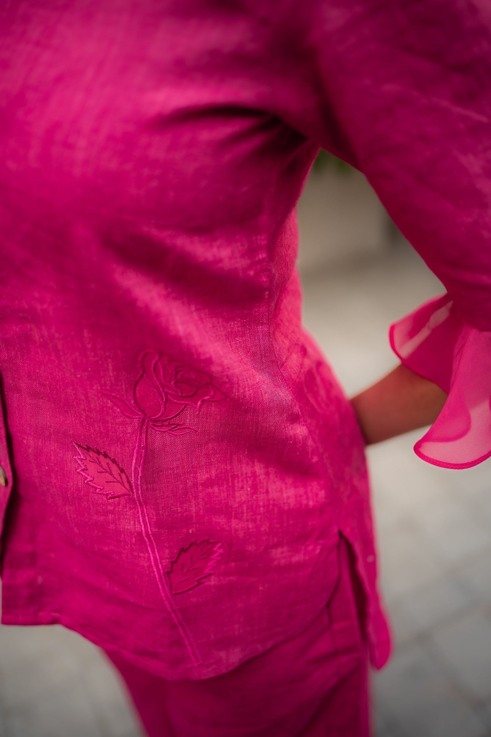 Made from breathable linen, this set provides comfort and a structured aesthetic. Rose embroidery accents the shoulders and lower portion of the pieces, adding a subtle, textured element. The flared sleeves add a touch of playfulness, creating a relaxed look. The natural drape of the linen complements the relaxed silhouette, making it suitable for various occasions. This set balances effortless style with understated embellishment.